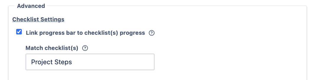 If your cards contain multiple checklists, you can configure the field to track progress for a specific one. In the field settings, enter the checklist name in Checklist Search. The progress bar will then only track items from checklists that match that name.