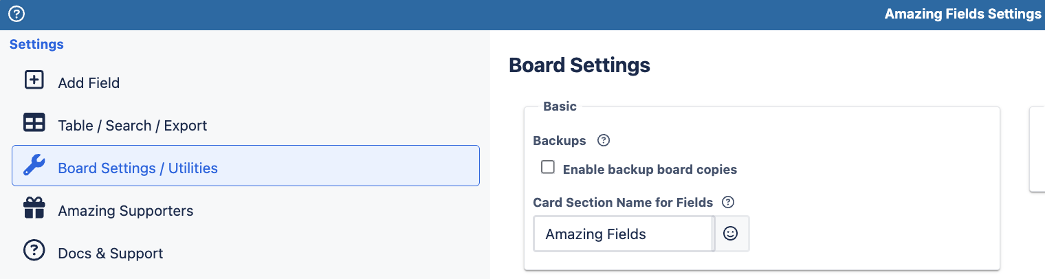 - Open Amazing Fields Settings by clicking the Amazing Fields icon in the top-right corner of the board.