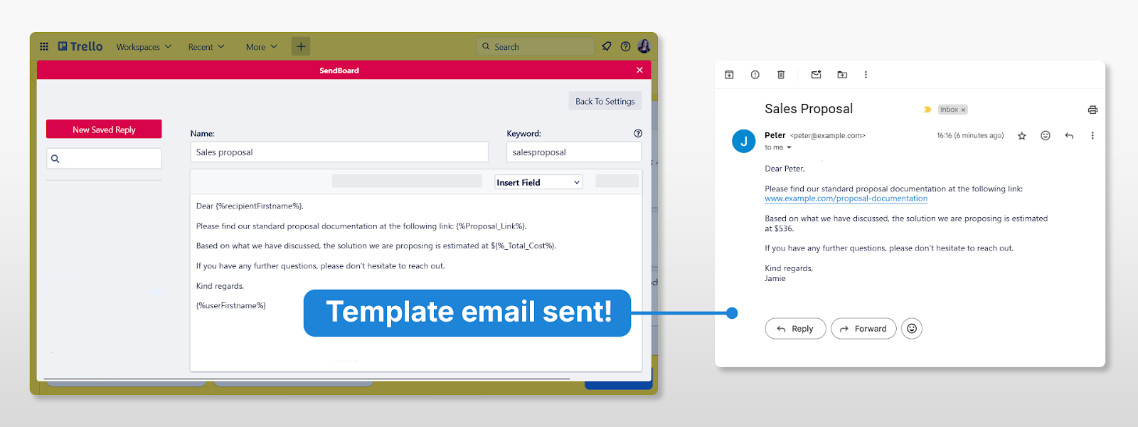 Email for Trello’s Saved Reply feature lets you set up template emails with variables that automatically populate with the relevant values when you hit send. This can be a big time-saver if your team sends lots of similar proposals, or other routine emails like sales pipeline updates to management.