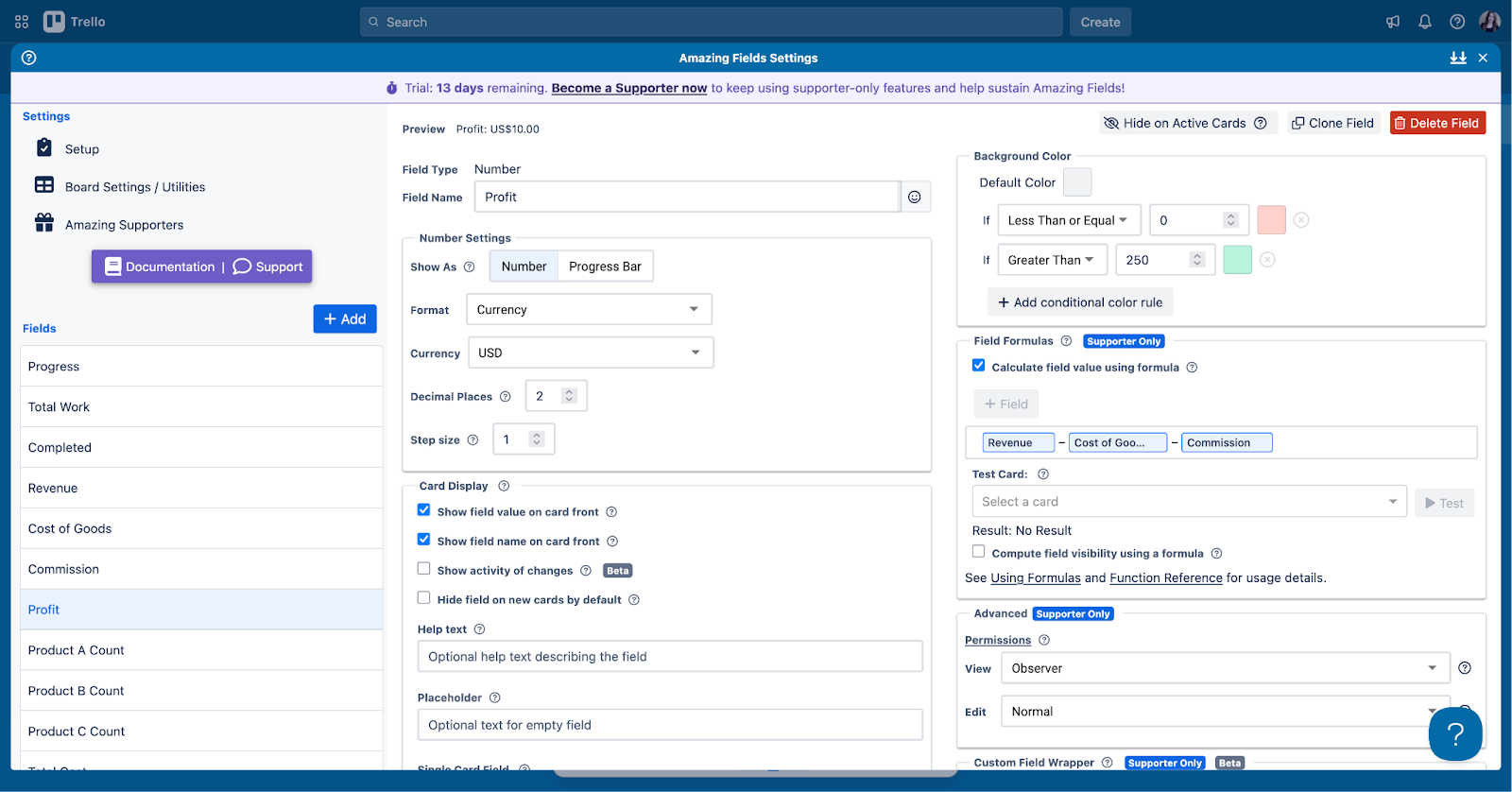 Amazing Fields is not only handy for data that your team commonly uses (like cost of goods, or commission percentage), it also allows you to use formulas to calculate the value of a field based on other fields on the same Trello card. Just like you would on a spreadsheet!