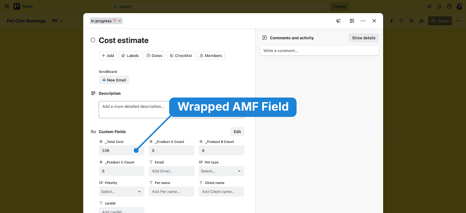 The wrapped field ‘_Total Cost’ will now be displayed as a Trello Custom Field, synced with the AMF field.
