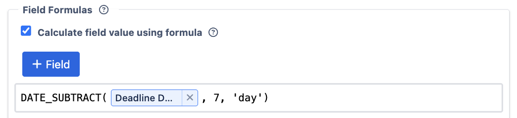 | Set a 30-day deadline from a field | DATE_ADD({Created Date}, 30, 'day') |