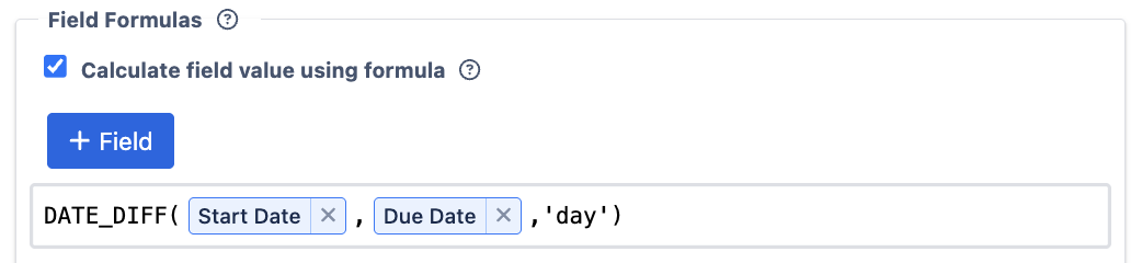 | Days between start and due date | DATE_DIFF({Start Date}, {Due Date}, 'day') | Number of days (whole) |
