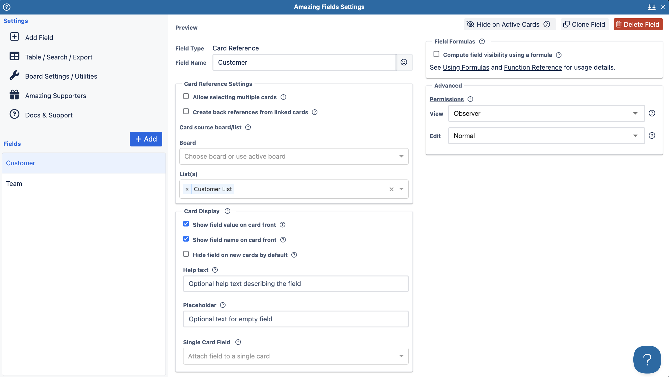 Need help? If you get stuck with card reference field settings, use the help icon in Amazing Fields to get in touch with support.