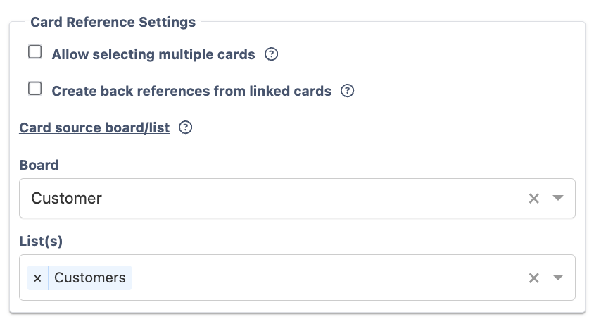This article explains the specific settings available for Card Reference fields in Amazing Fields. Once you've added a Card Reference field to your board, these settings control which cards users can link to and how multiple selections are handled.