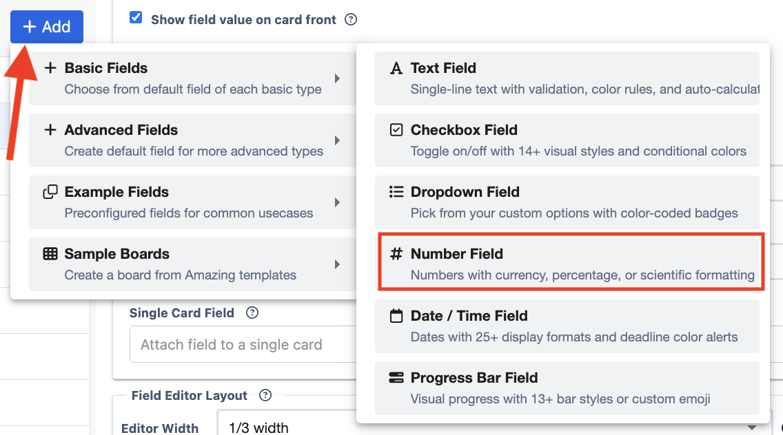 Note: Number fields can be used in formula fields to calculate totals, averages, or derived values across a card. See: Using Formulas to Calculate Field Values.